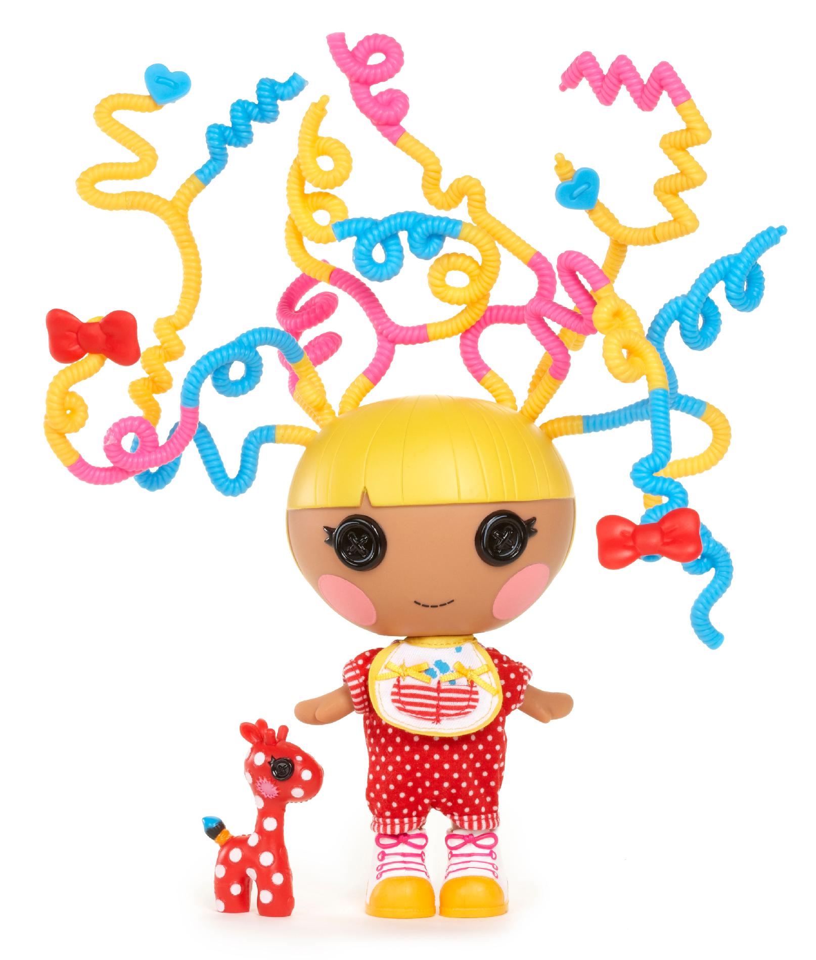 A Silly Hair Lalaloopsy is a doll that acts like an average Lalaloopsy doll. However, as the name would imply they have a "silly hair" feature. The hair is not of a soft material, but of coils of thin, hollow plastic. Each doll comes with a curling brush, as well as a few accessories specific to each character. They also wear outfits vaguely modified from their normal outfit, and come with a pet.